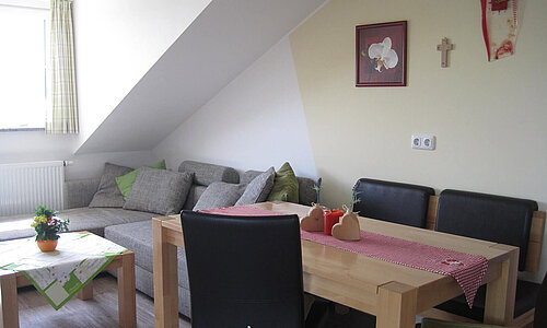 In unserem Ferienhaus direkt neben unserem Bauernhof befindet sich die gemütlich und modern eingerichtete Ferienwohnung mit großen Gauben in jedem Zimmer, hat einen überdachten Balkon und eine schöne Aussicht in die Allgäuer Alpenkette.
